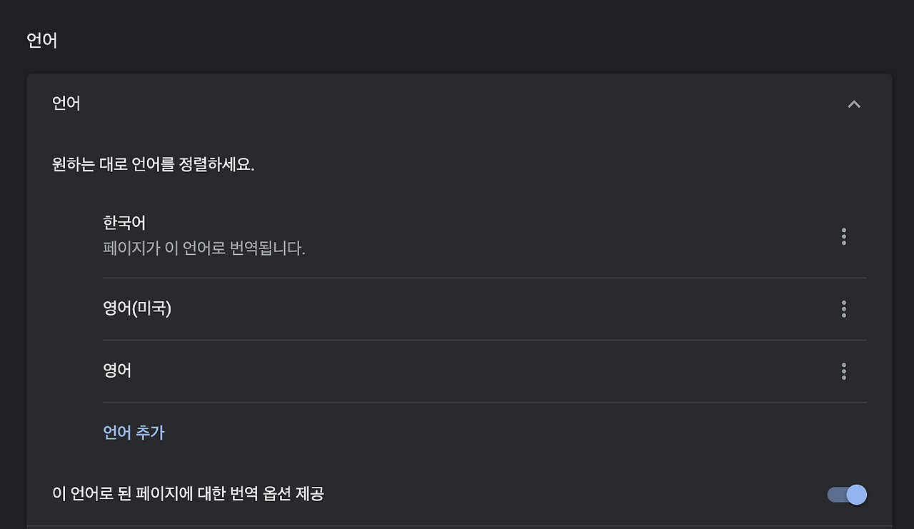 위에서 말했지만 요청시 헤더에 Accept-Language 의 값을 변경해서 국제화를 테스트할 수 있는데, 크롬 기준으로 웹 브라우저 언어 설정 값을 변경하면 페이지 요청시 Accept-Language 의 값이 변경됩니다.