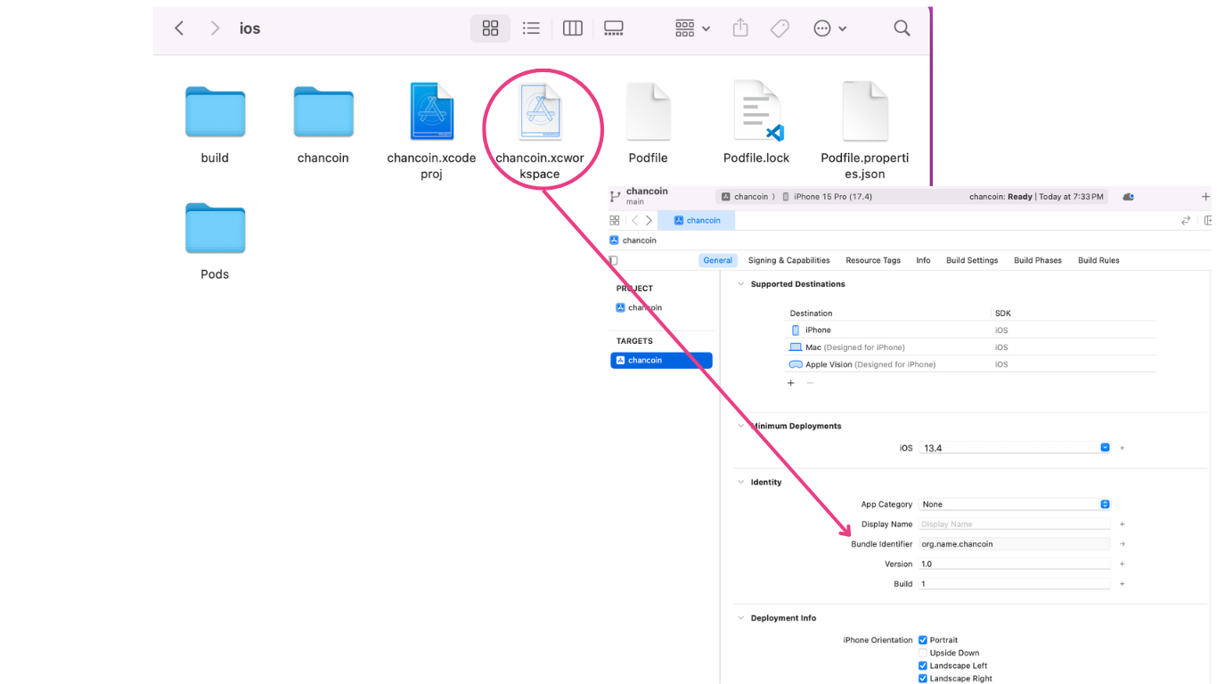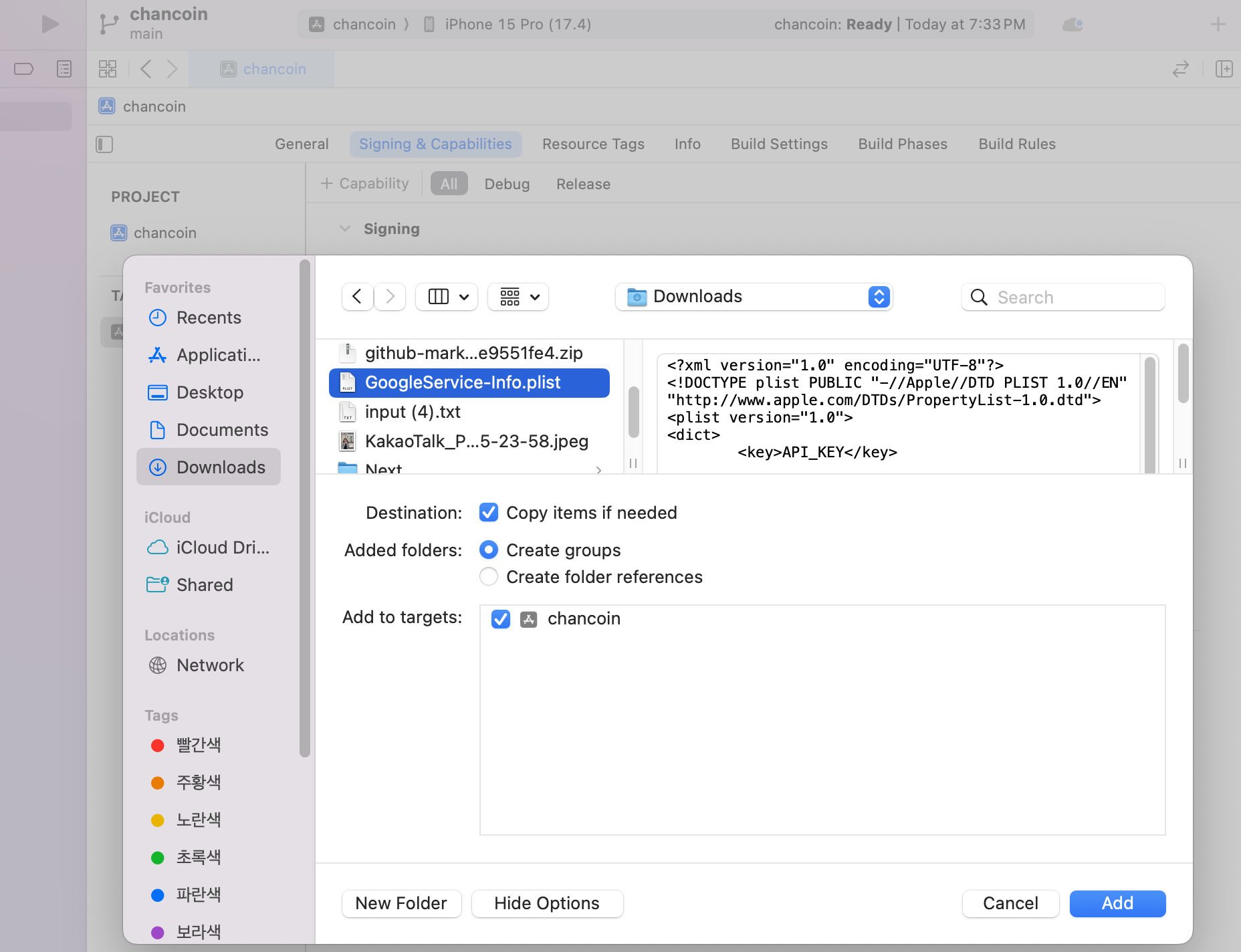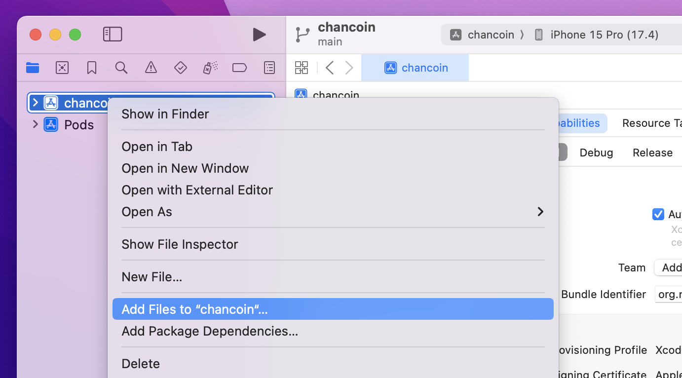 아까 Bundle Identifier 를 참고하기 위해 열어둔 곳에서 폴더명에 우클릭을 하면 addFiles to "chancoin" 이 나오실 것입니다.