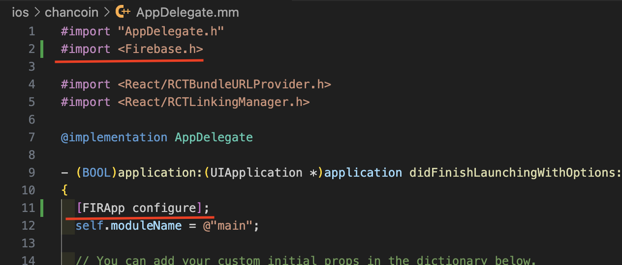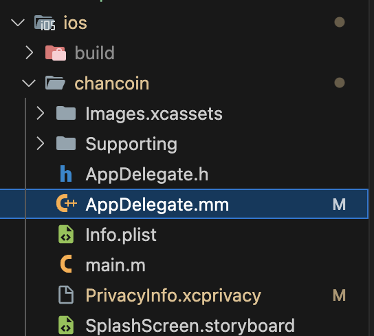 ios 폴더 안에 내가 만든 프로젝트 이름인 폴더로 들어가면 AppDelegate.mm 이라는 파일이 나옵니다. 해당 파일을 클릭 한 뒤에