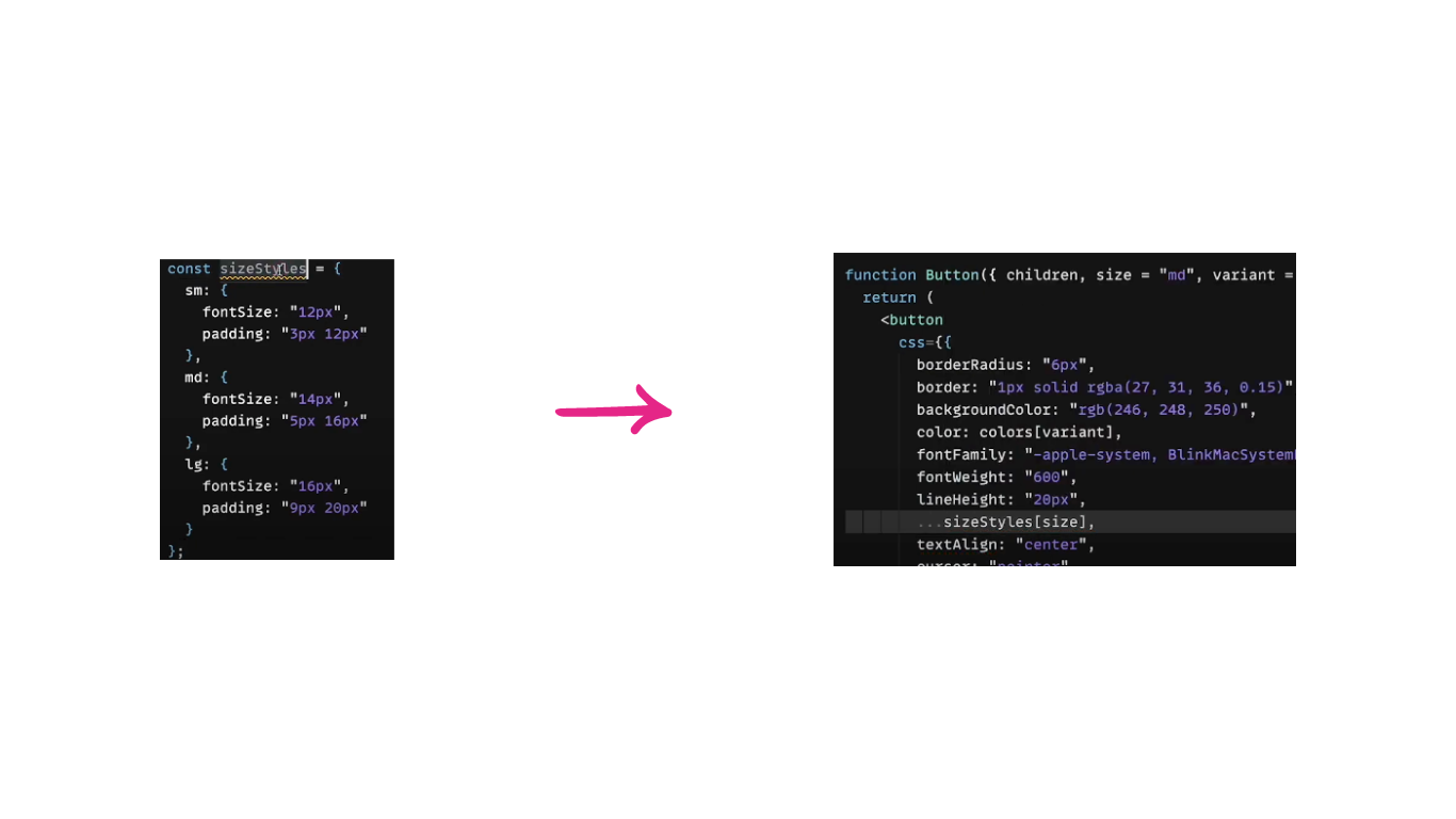 sizeStyles 는 객체이기 때문에 오른쪽 코드를 보시는 바와 같이 스프레드 연산자를 이용하셔야 합니다.