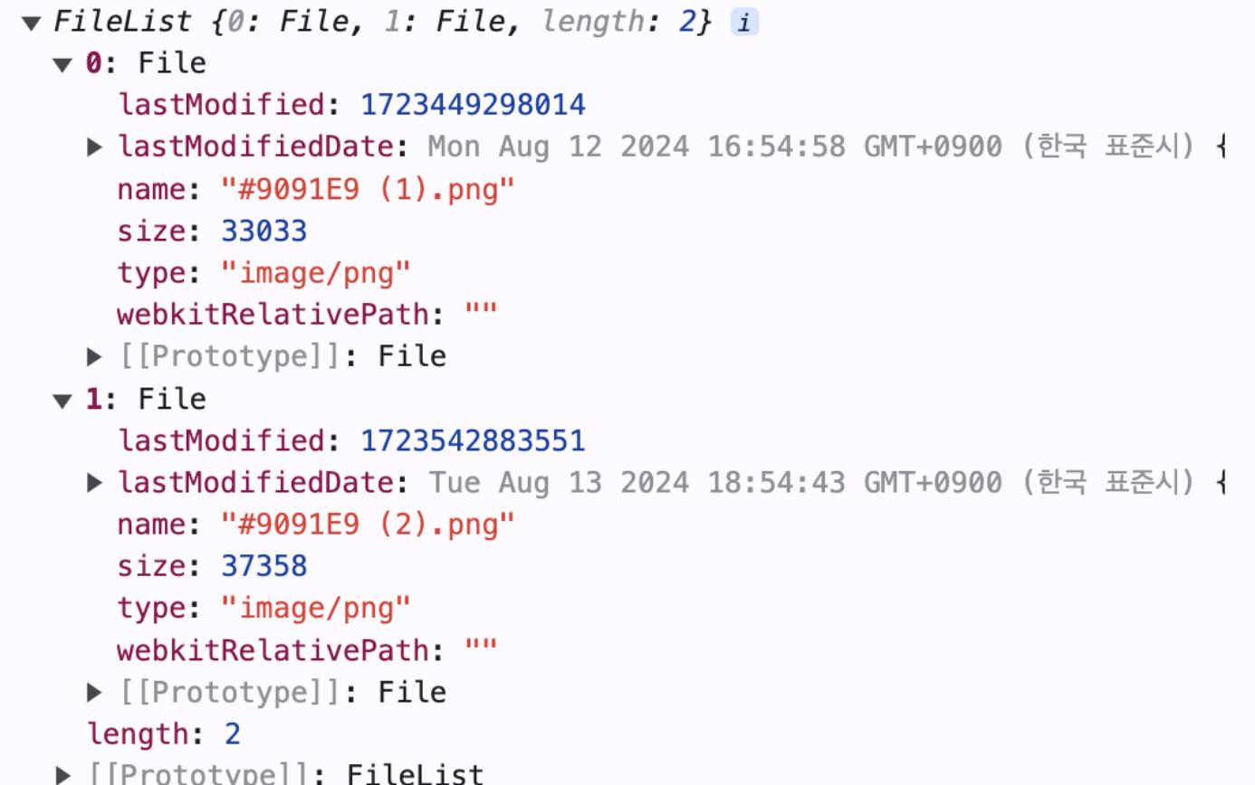 files 라는 변수 안에 이미지를 2개 이상 저장하고 출력하면 아래와 같은 구조가 나옵니다.
