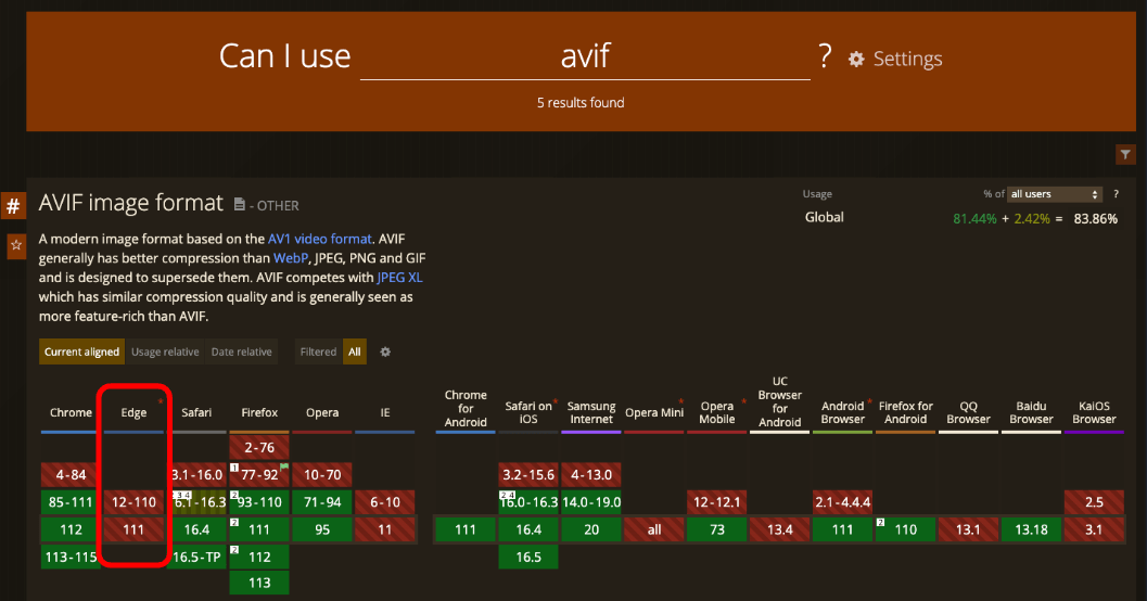 하지만 그림에서 보시는 바와 같이 avif 를 아직 지원하지 않는 브라우저가 존재하고 있습니다.