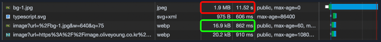 첫 번째 요청이 끝난 후에 다시 동일한 이미지를 요청하는 경우에는 이미지 최적화 되어 있는 이미지를 재사용하기 때문에 좀 더 빠르게 응답하는 모습을 볼 수 있습니다.