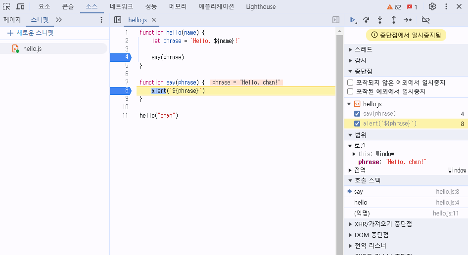 실행이 다시 시작되다가 함수 say() 안에 설정한 중단점에서 실행이 멈춥니다.