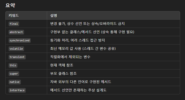 자주 사용하는 static, final, abstract, super, this, interface 에 대해서 설명하겠습니다.
