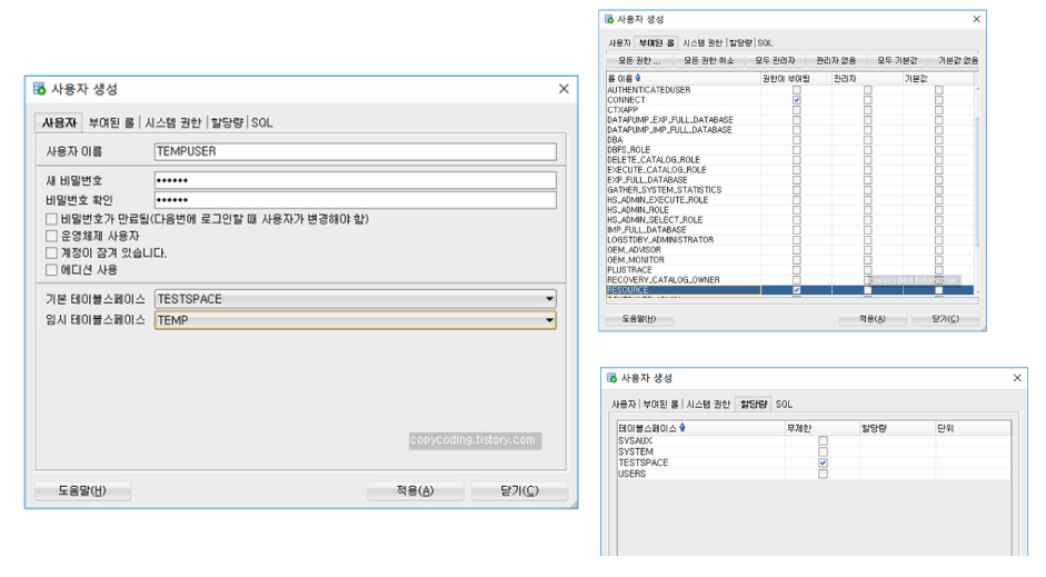 사용자 이름을 적당한 이름으로 입력을 하고 테이블스페이스에 신규로 생성한 테이블스페이스를 선택합니다.
