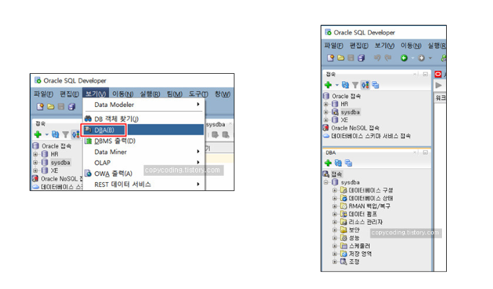 아래와 같이 메뉴에서 보기 > DBA 를 선택합니다.