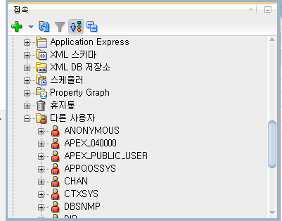 접속 탭에 생성한 sysdba 를 확장하여 아래로 완전히 내리면 다른 사용자가 나오는데 확장을 하면 등록된 사용자들을 볼 수 있습니다. 사용자를 신규로 생성하고 테이블스페이스와 연결하여 사용 가능하도록 만들어야 합니다.