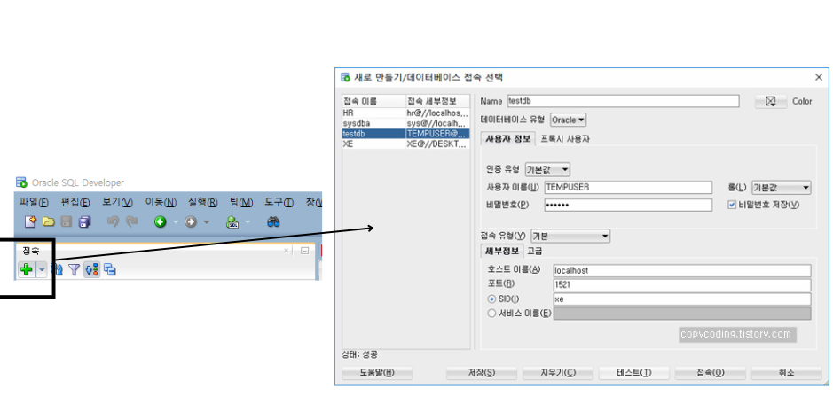 이후 테스트 버튼 -> 저장 버튼 -> 접속 버튼 순으로 클릭을 합니다.