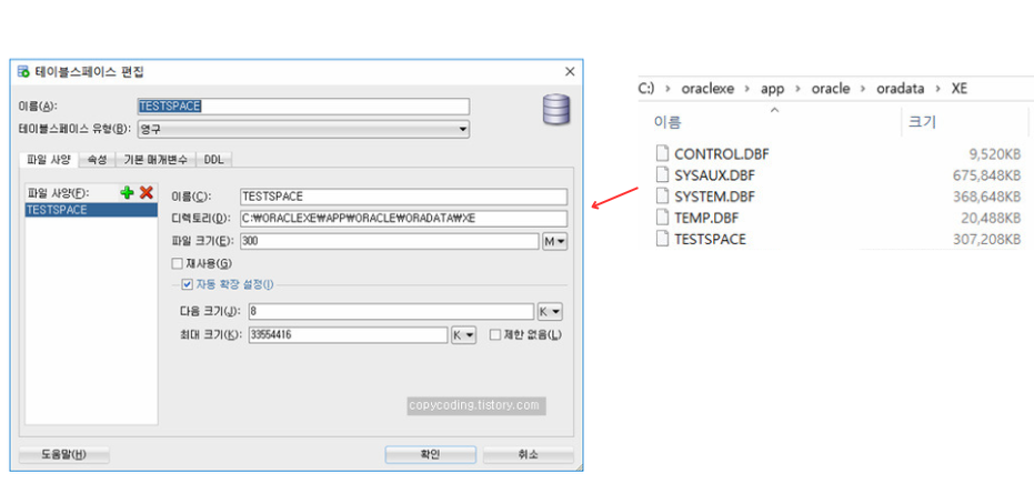 새로 만들기을 클릭하면 테이블스페이스 생성이 나오는데 원하는 설정 값을 넣어 테이블스페이스를 만들시면 됩니다.