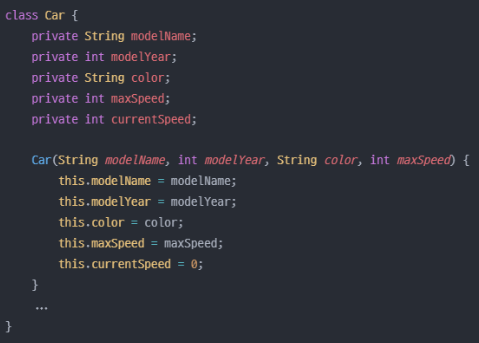 우리가 변수를 선언할때 int a = 1 처럼 변수에 값을 초기화 하는 것처럼, 객체를 선언 할때 Car mycar = new Car(값1, 값2) 처럼 클래스에 입력값을 보내 객체의 값을 초기화 해 줄수 있습니다.