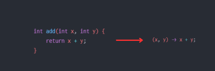 아래와 같이 int add(int a, int b) {} 메소드 표현식을 메서드 타입, 메서드 이름, 매개변수 타입, 중괄호, return 문을 생략하고, 화살표 기호를 넣음으로써 코드를 함축했음을 볼 수 있습니다.