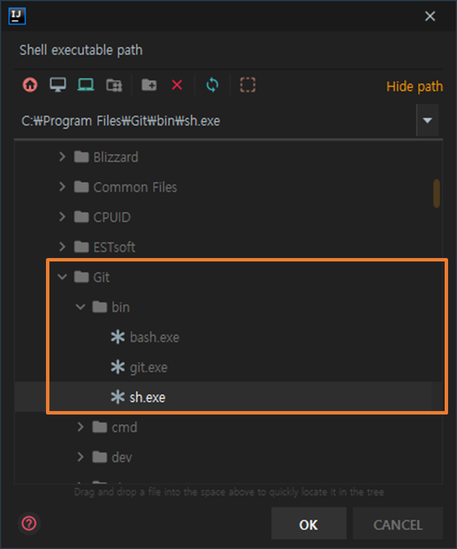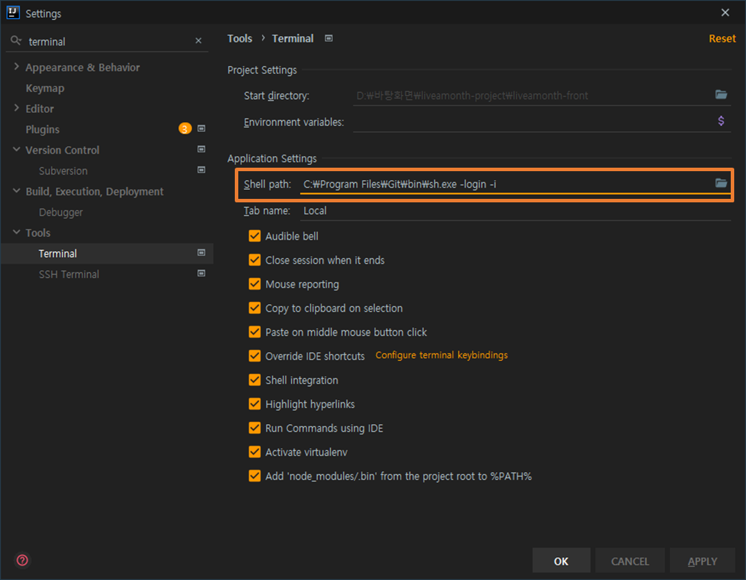 이제 Shell Path 에 Git Bash .exe 경로를 잡아서 변경하시면 됩니다.