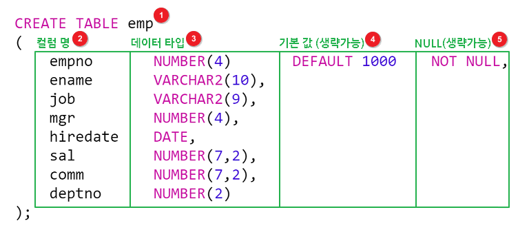 오라클에서 테이블을 만들기 위해서는 CREATE TABLE 을 사용하여 컬럼명, 데이터 타입을 정의하여 테이블을 생성하면 됩니다.